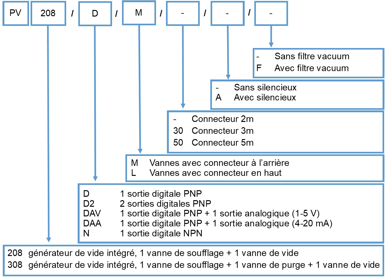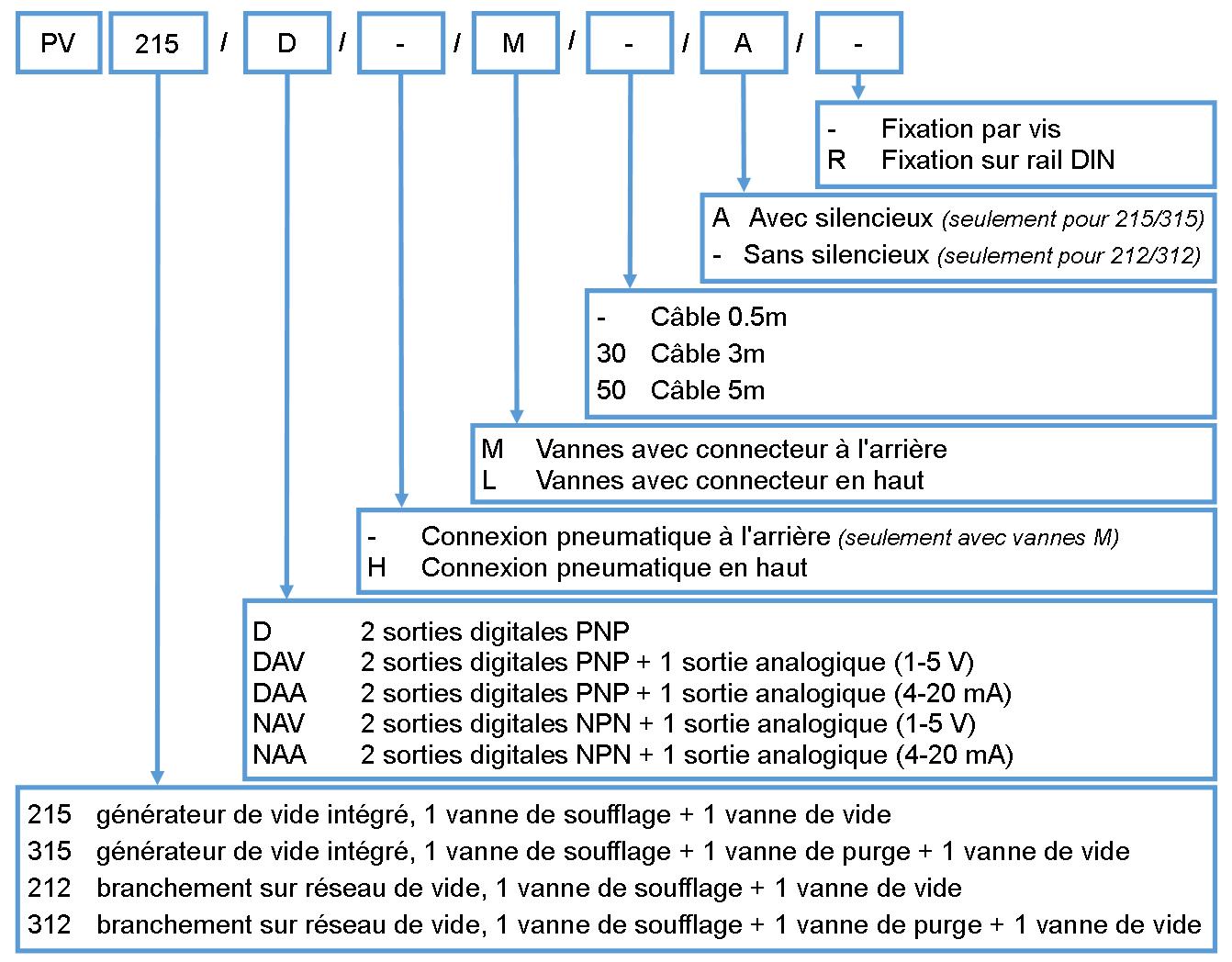 Ces modules sont également disponibles sans générateur de vide, pour branchement sur réseau de vide externe (PV212 et PV312).