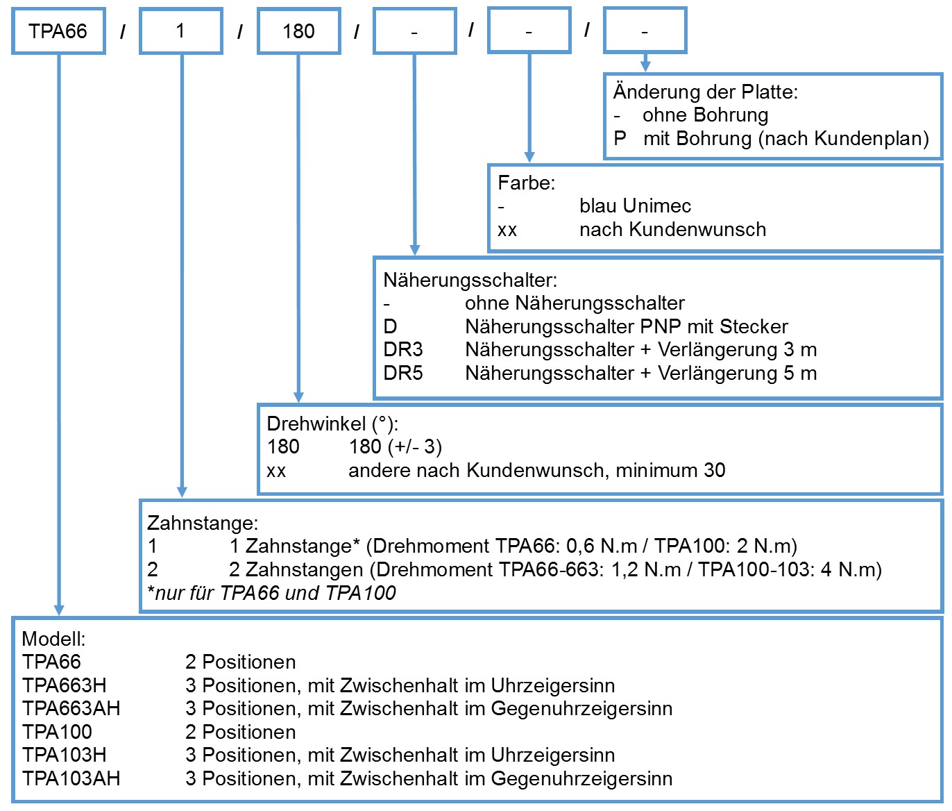 Die Achse des Rotationstisches ist auf vorgespannten Präzisionskugellager gebaut. Die wechselnde Drehbewegung wird durch ein pneumatisches Ritzel-Zahnstangensystem gesteuert. Ein in der Zahnstange eingebauter hydraulischer Stossdämpfer fängt die Stösse am Ende der Drehbewegung auf.