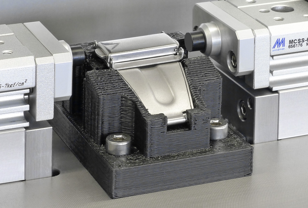 Le fermoir est fixé à plat sur la machine. L'ouverture est réalisée par trois actionneurs pneumatiques : deux actionneurs déclenchent les poussoirs latéraux, puis un actionneur ouvre le fermoir.