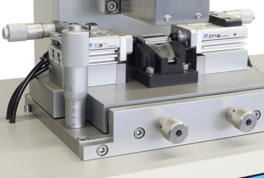 La fermeture du fermoir est réalisée par une tête de mesure motorisée intégrant un capteur de force et permettant de mesurer la force et la position de fermeture. Des graphiques statistiques permettent d’observer l’évolution de la force/positon. Cette tête de mesure est montée verticalement sur l'équipement. Des limites maximum de force peuvent être définies.