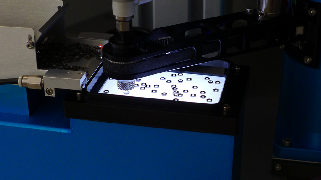 Vollautomatische Beladungsmaschine, die speziell für die Beladung von Platten mit Komponenten für die Hochwertige Uhrenindustrie entwickelt wurde, wie z. B. Schrauben, Räder, Achsen, Zapfen, usw.